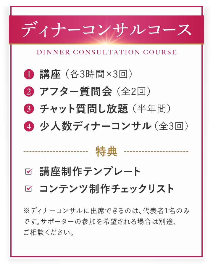 ❖ スタンダードコース 280,500円(税込) ❖ ディナーコンサルコース 390,500円(税込) |